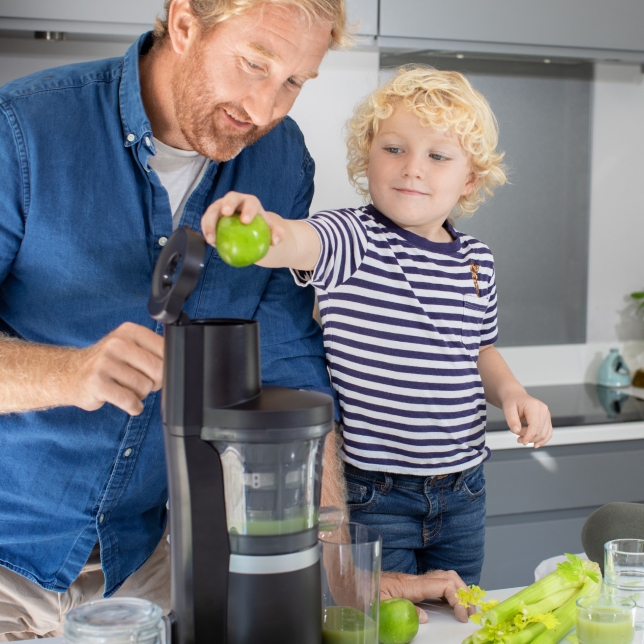 Copiii pot învăța la rândul lor secretele mâncatului sănătos cu storcătorul de fructe și legume lent MJ-L700. Atunci când capacul este deschis, produsul se oprește automat, pentru o siguranță deplină. Pentru prepararea mai rapidă a sucului, capacul are o deschizătură prin care ingredientele de dimensiuni mai mici, precum morcovii, pot fi adăugate imediat în timpul funcționării, când capacul este închis.
