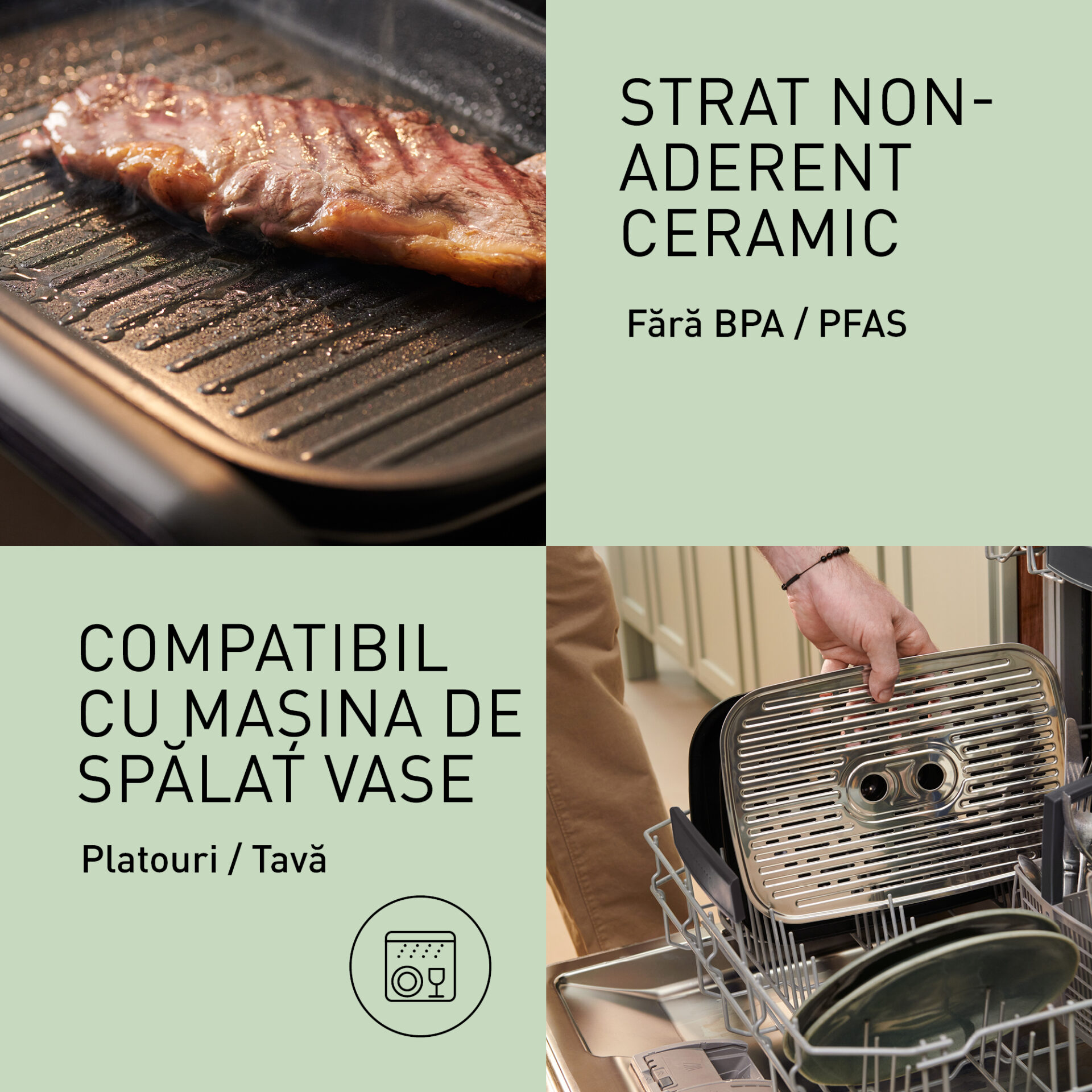 Lăsați-vă inspirați de o gamă variată de platouri de gătit și de toate funcțiile utile de care aveți nevoie pentru o călătorie culinară în jurul lumii alături de familie sau prieteni:• 6 platouri de gătit ușor de schimbat• Aplicație gratuită cu peste 100 de rețete, de la bucătăria europeană la cea asiatică• Extractor de fum pentru o experiență plăcută de gătit și luat masa• 9 programe automate și operare manuală• Interval larg de temperatură: 40°C – 250°C• Curățare ușoară, compatibilă cu mașina de spălat vase• Funcție practică de menținere la cald• Design ușor de depozitat• Plăci și oală fără BPA și PFAS