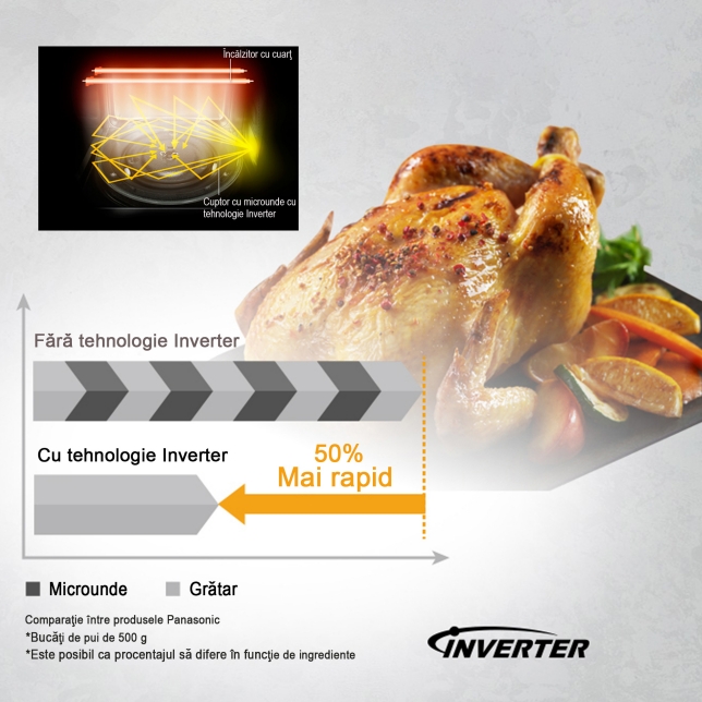 Graţie tehnologiei Inverter, puterea microundelor prepară rapid mâncarea, în timp ce funcţia de grătar asigură rumenirea şi textura crocantă. Toate acestea se produc simultan, oferind un gătit mai rapid.