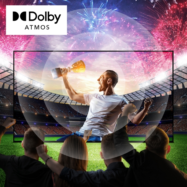 Dolby Atmos®> – prezent în cele mai noi cinematografe și pe televizoarele noastre premium redă sunetul cu o claritate, o bogăție și o profunzime uimitoare. Efectele sonore sunt plasate cu precizie în spațiul virtual și în timp pentru a vă introduce în atmosferă.